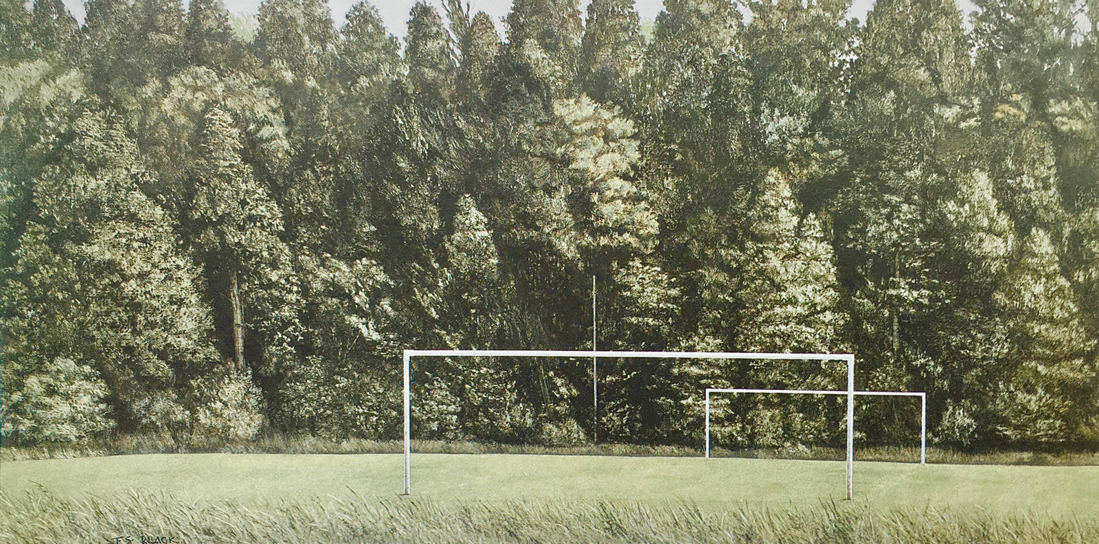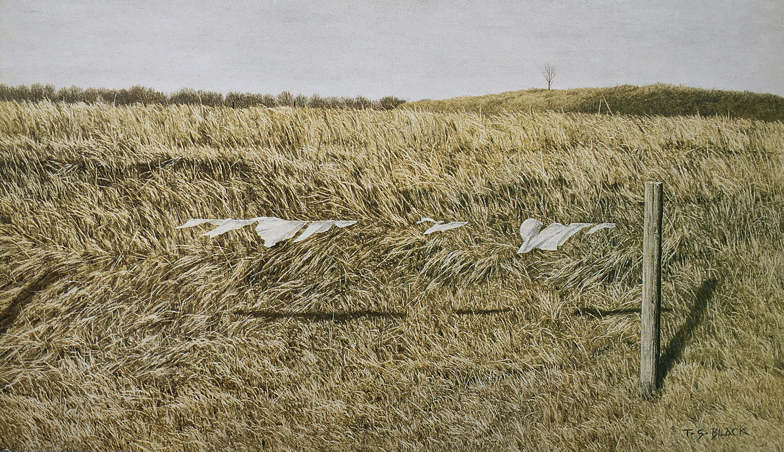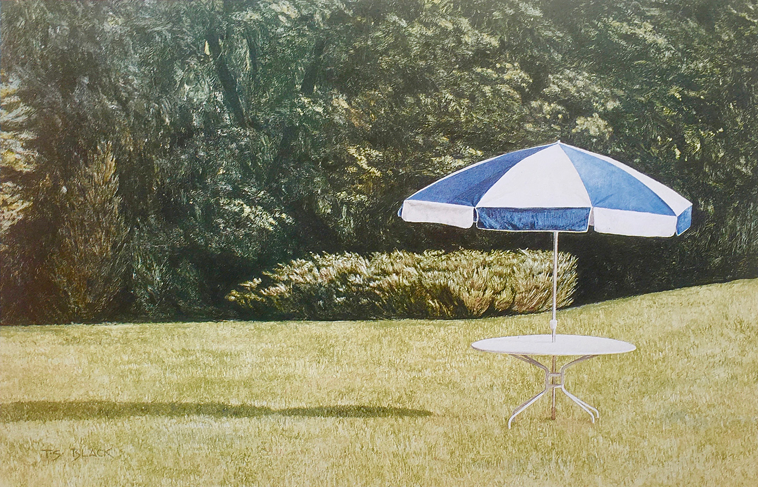 We already encountered this in Balance Owing and Steady March, but it is also evident, for instance, in Above the River, where there is no indication that a river is present in the painting. That a river flows beneath the empty bench on the high bluff and that someone might have possibly climbed down to the stream must be deduced. Black alerts us to his intention and gives clear guidance when he says, “The title… [often] encourages the viewer to deal with something that is not in the picture. I like the idea of a picture being bigger than what I’ve been able to fit in the painting.” He also says, “I want my viewers to touch my paintings in some way.”