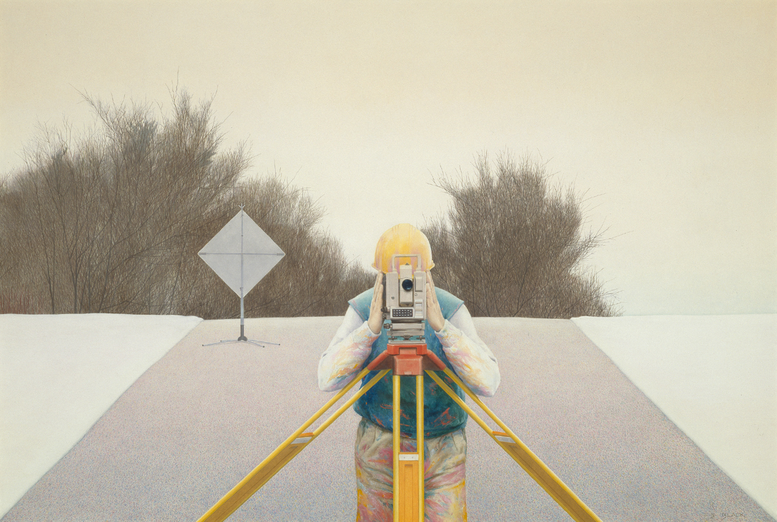 When we move to Devices and Desires, it’s almost as though the figure in Private Practice shed its toque and anorak, donned a hard hat and turned around to confront us. What in the world is happening here? Although the figure now faces us, we still encounter a persona with no face. Staring at us instead is the oculus of a theodolite, a sophisticated computerized surveying instrument used to measure and plot topography, perched on top of a tripod. Behind the tripod the figure steadies the equipment and presumably focuses it with full attention on the viewer. More disconcerting elements emerge.
