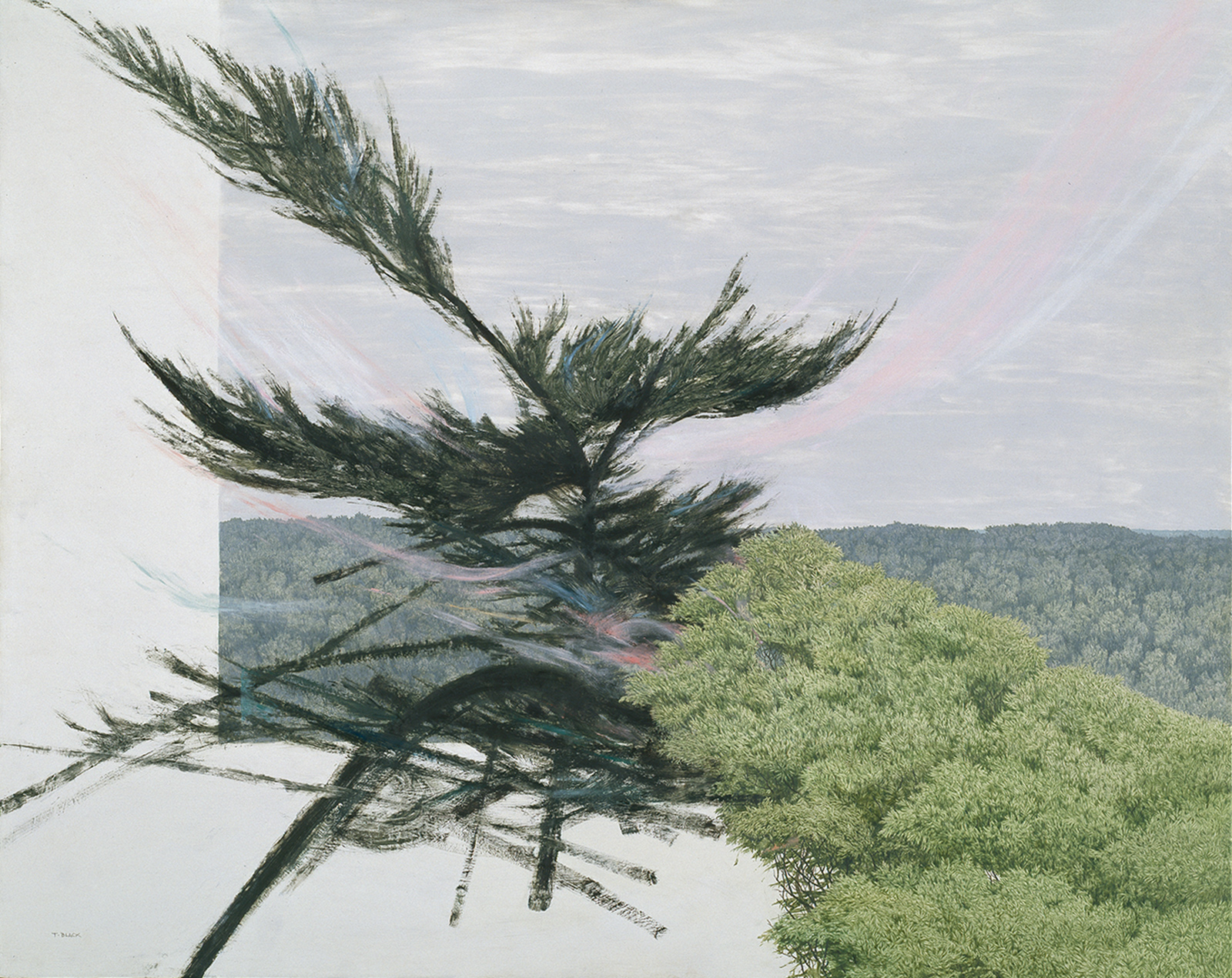 Perhaps all of the expressive elements of Black’s work are best summed up with stunning technical economy and elegance in his painting of a single wind whipped and weathered pine placed boldly in the absolute foreground of an expansive forested landscape. With great gestural strength reminding one of the work of Franz Kline or the calligraphic quality of Robert Motherwell’s gesturalism, Black breaks the boundaries of location and signs across the surface of the painting a tormented tree that feels like a great Chinese character written with nature’s ink. The precise place of the pine is indefinite. Which world does it belong to? A high slope in the landscape or in the portion of the painting yet to be? Its outstretched branches embrace every significant sector of the painting, spreading above and beyond, yet centred in intimate wisps of colour.