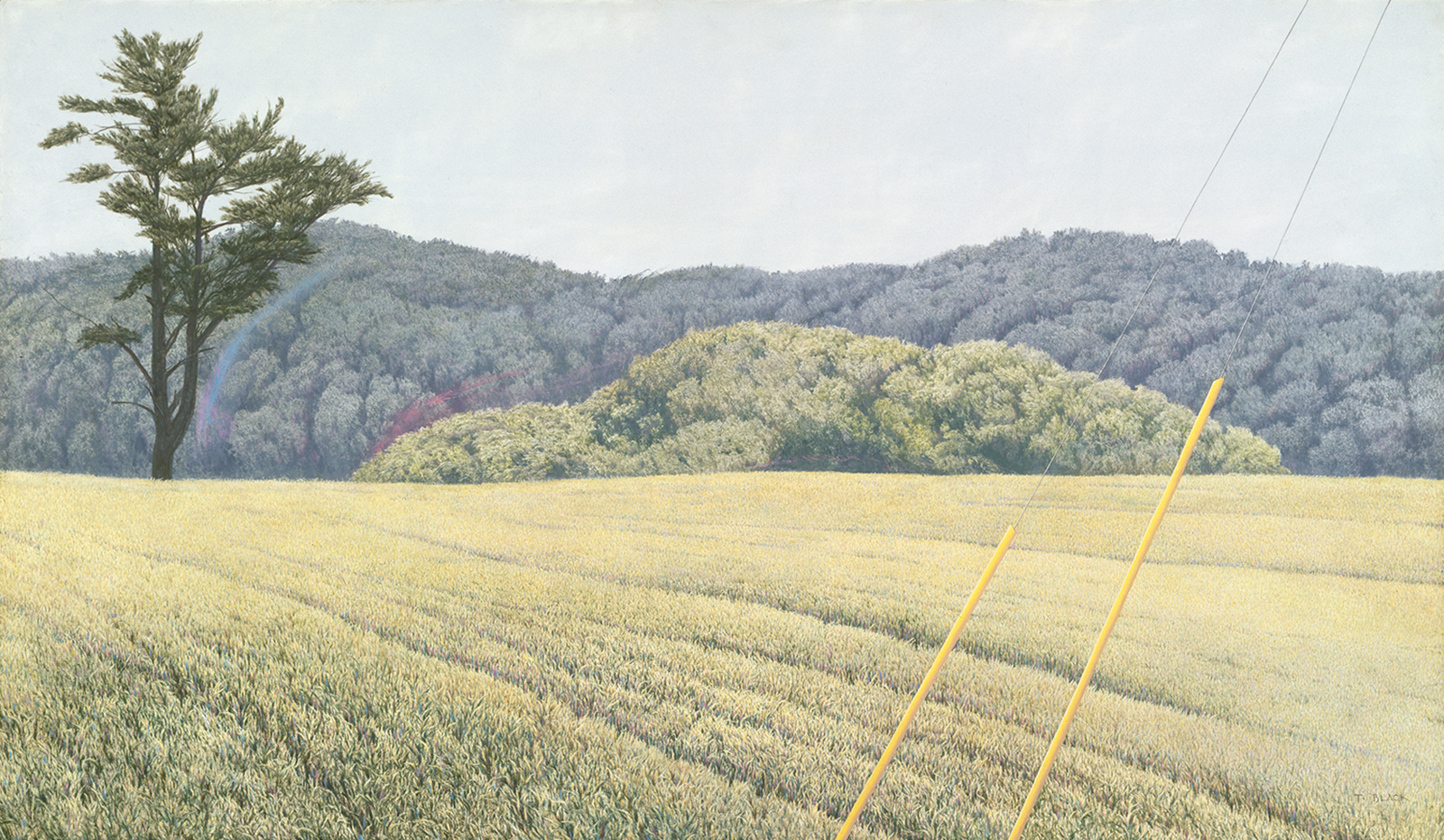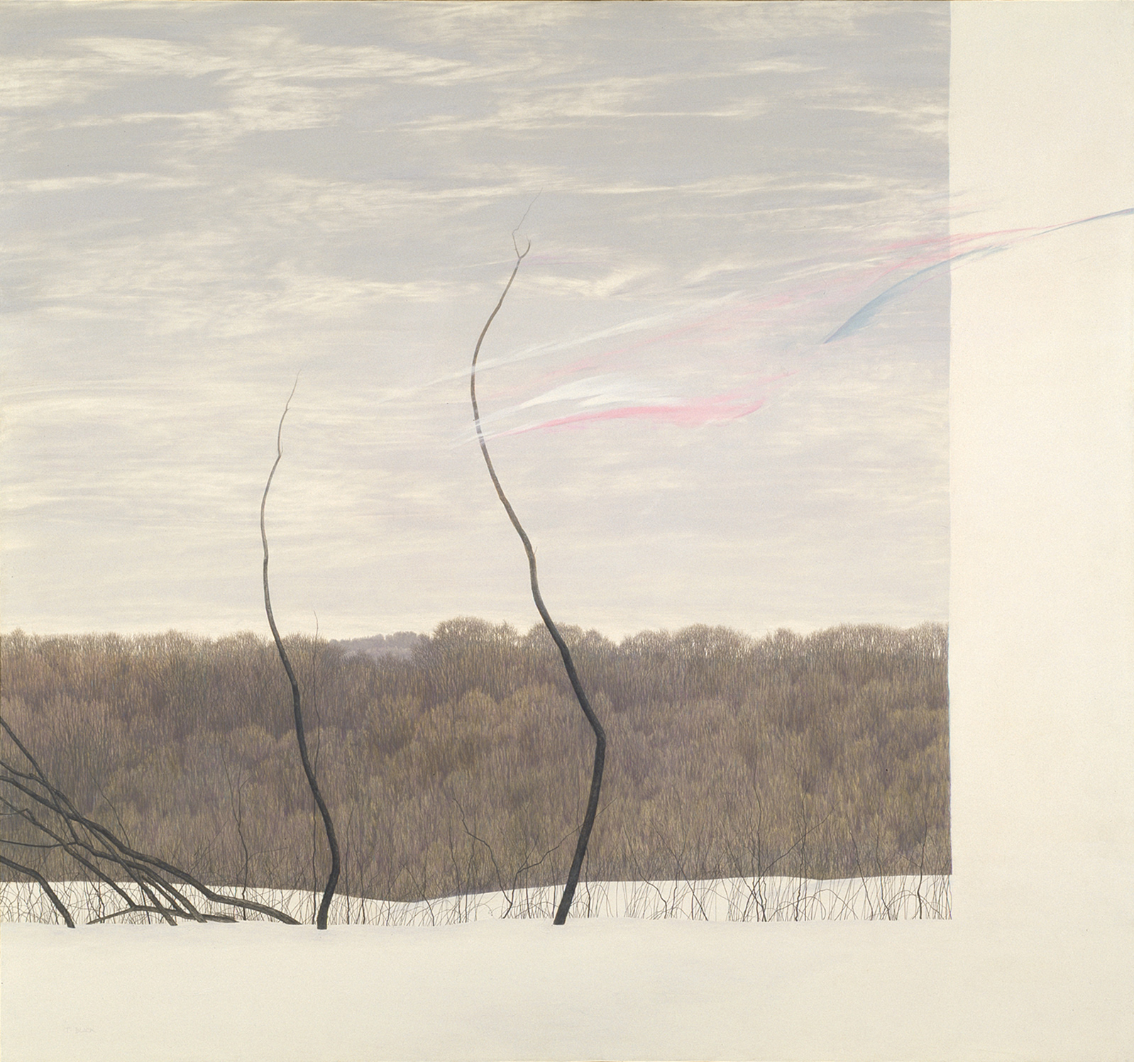 “It is a very formal painting… and it was fascinating for me to see how it was received. They grabbed it instantly. They were nodding in understanding long before the translator said anything to them. Compositionally, you have a triangle within a triangle. The black shape and the white shape are the same size, but one is inverted. There is symbolic balance between the cultivated world and the animal world, the wild world of the woods and forests beyond.”